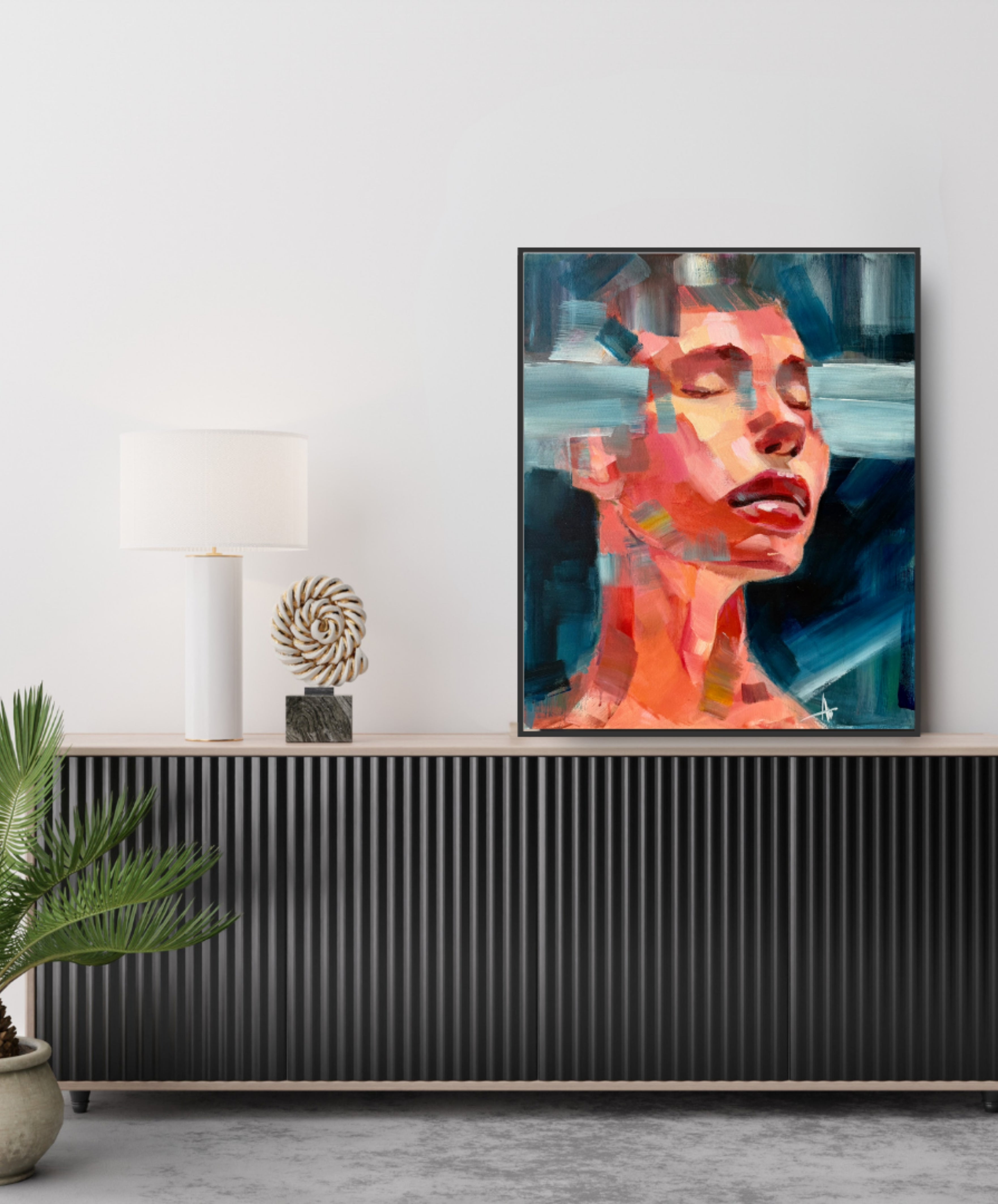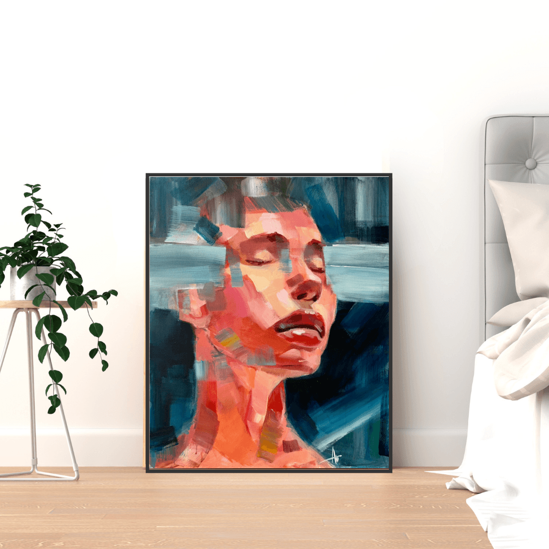The figure appears suspended between inwardness and release. Closed eyes deny the viewer access, while colour fragments the surface into emotional planes. The portrait resists resolution, holding a moment just before expression.